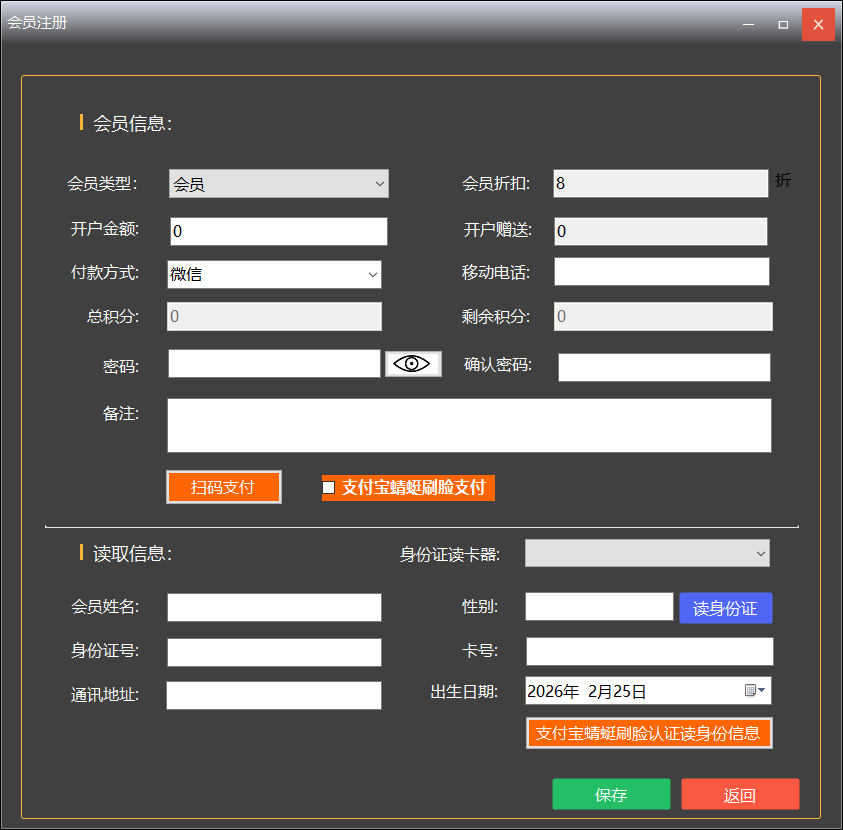 软件支持刷身份证读取会员信息,也支持手动输入