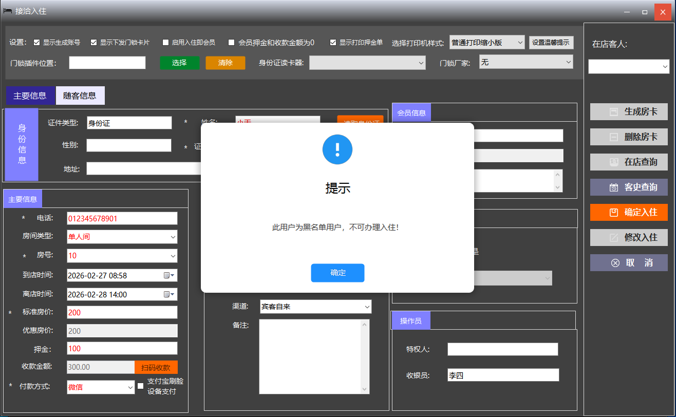 对于添加了黑名单的客户,想要入住的话会显示黑名单用户,拒绝入住