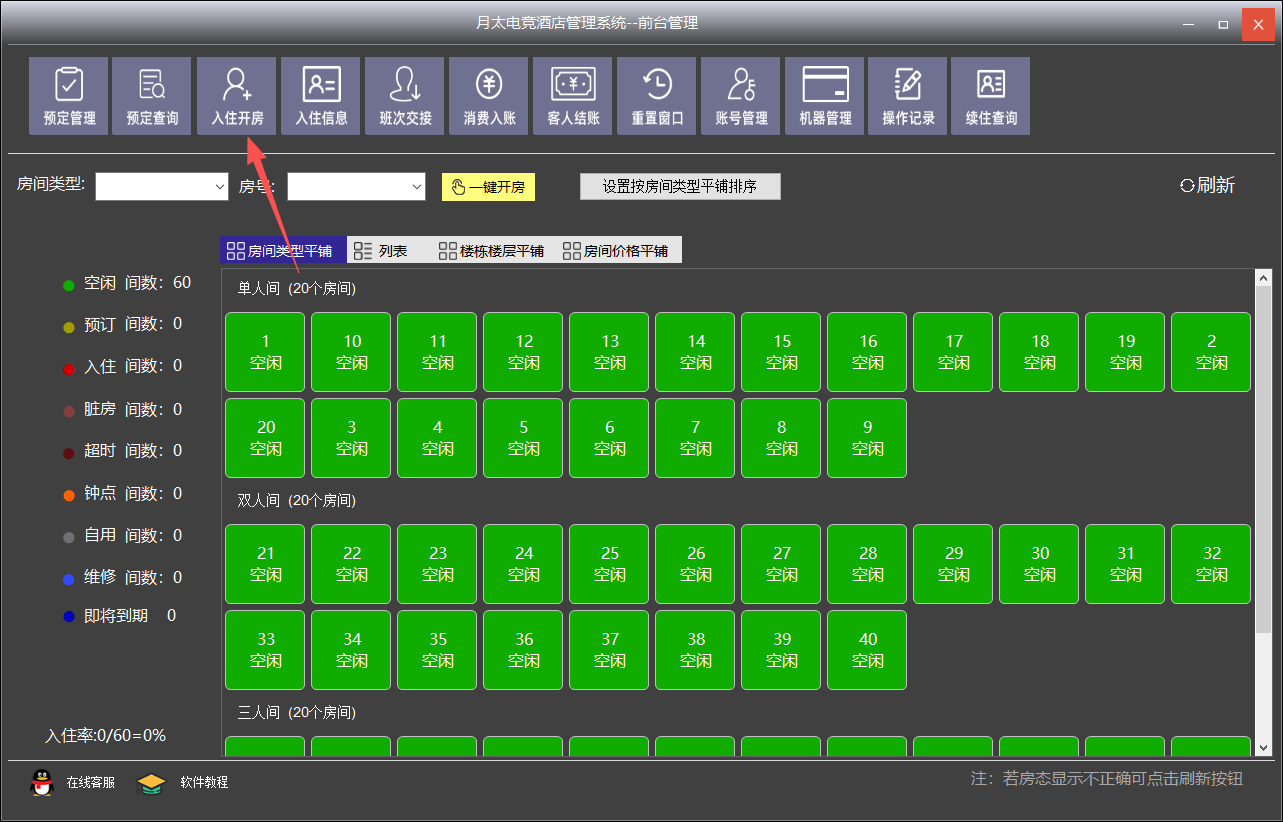 首先,点上方快捷功能图标:入住开房