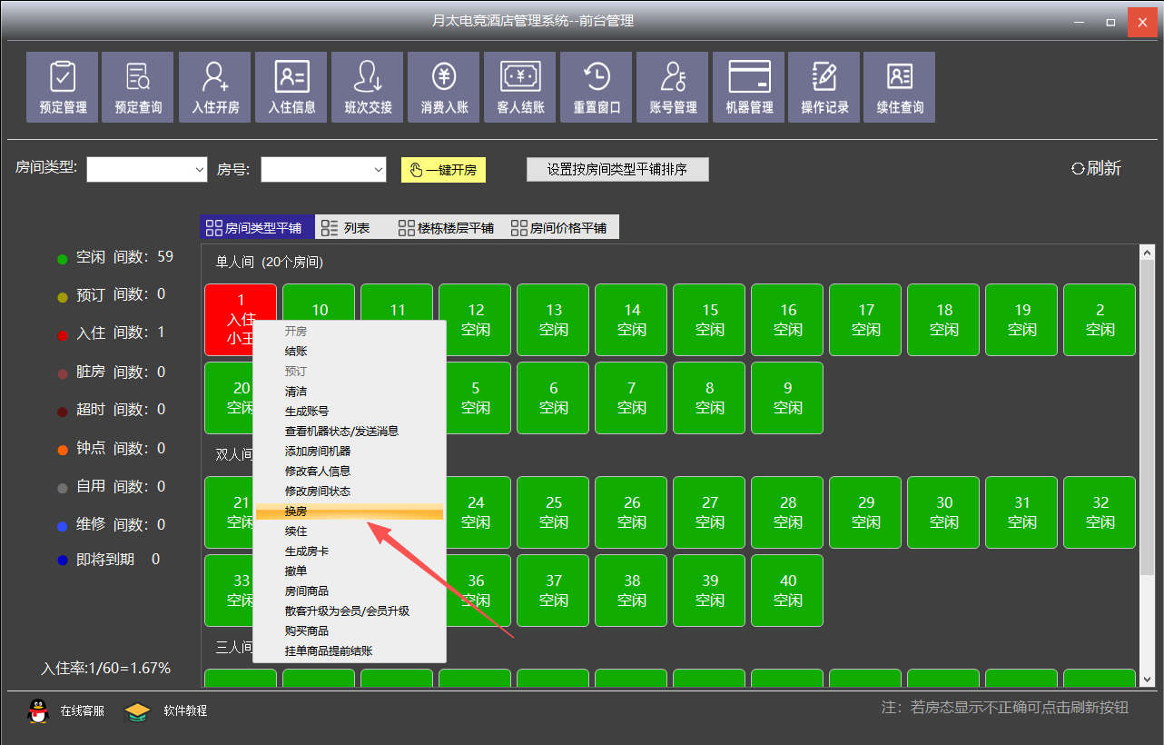 用户入住完,右键点击选择换房按钮。
