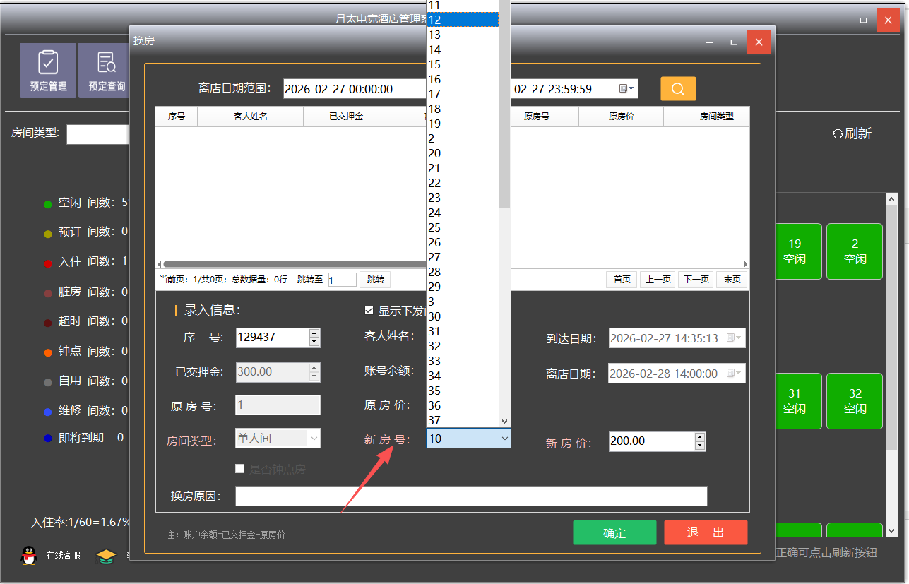 换房界面,可以选择其他空余房间,房间类型和价格可自动获取,确定即可完成换房操作