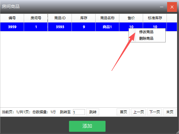 在前台管理界面 , 右键选择房间号---房间商品